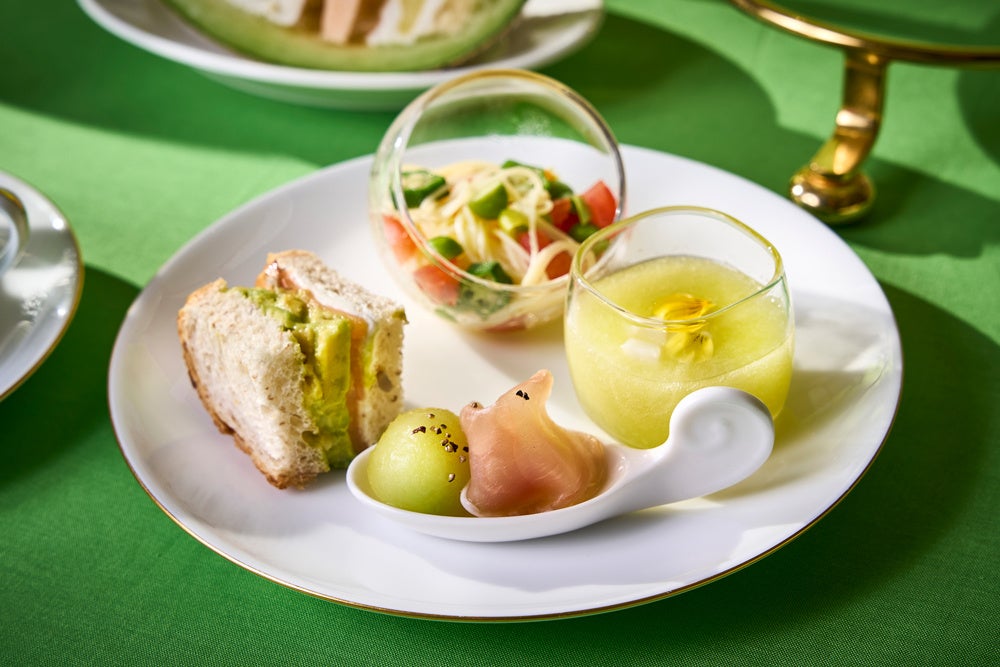 スイーツには、フィナンシェの上にメロン風味のバタークリームで紫陽花をかたどった「紫陽花ケーキ」をはじめ、ロールケーキやムース、ブッセなど、メロンをさまざまな形で味わえる全7種をご用意しました。爽やかな風味と果実感あふれる彩りが、初夏のティータイムに優雅な華やぎを添えます。また、セイボリーには生ハムメロンボールやホタテ貝柱のマリネ メロンスープなど、塩味とのバランスを楽しめるラインナップ。さらにケーキクラム、シャンティ、メロンムース、果肉、ジュレが重なり層をなす「メロンのレイヤーケーキ」もスペシャルプレートでご提供。見た目も美しく、最後の一口までメロンの余韻に浸っていただけます。初夏の訪れを五感で感じる、贅沢なティータイムをぜひご堪能ください。