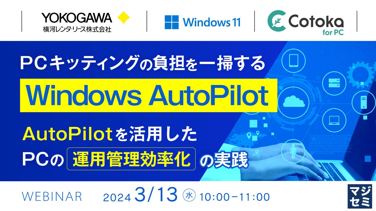 本セミナーでは、Windows Autopilotの活用により、PC初期キッティングの負担をなくす方法を解説します。Windows Autopilotは、新しいデバイスの導入や構築を自動化するためのクラウドベースのサービスで、これにより、IT部門の作業負荷を大幅に削減することが可能となります。さらに、PCの初期キッティングから運用、廃棄までPCのライフサイクルが自動で回るサービス『Cotoka for PC』もご紹介予定です。Autopilotの活用を検討中のITマネージャーやPC管理者の方はぜひご参加ください。