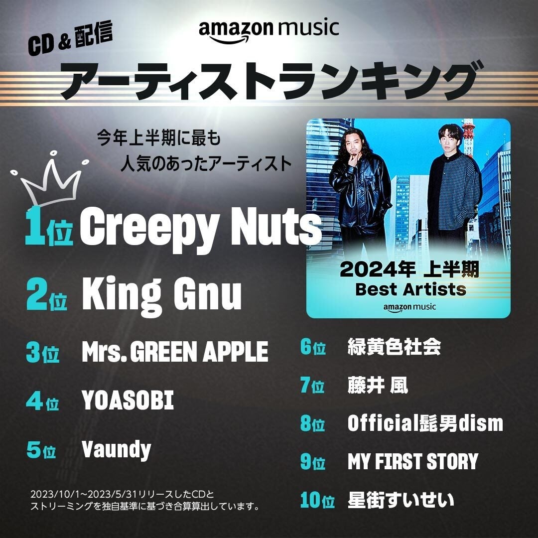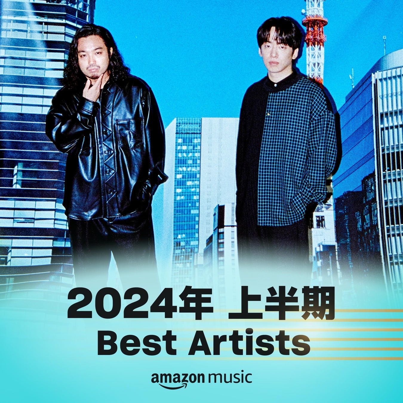 2024年上半期Best ArtistsはCreepy Nutsです。2024年の音楽シーンを語る上でもはや説明不要のレベルまで達した、日本中のキッズから大人までを躍らせた「Bling-Bang-Bang-Born」はテレビアニメ『マッシュル-MASHLE- 神覚者候補選抜試験編』オープニングテーマとして書き下ろされ、2024年1月7日に配信リリースされました。オープニングムービーに合わせた通称「BBBBダンス」がSNSなどで流行し、アニメ作品出演声優のダンス動画投稿から火がつき、配信開始からわずか7週間でBillboard JAPANにおけるストリーミング1億回再生を突破するなど、瞬く間に日本音楽シーンを代表する楽曲となりました。ランキング発表時の6月時点でもAmazon Musicで公開している「人気の楽曲」のランキング上位にランクインしており、この勢いは止まりそうにありません。