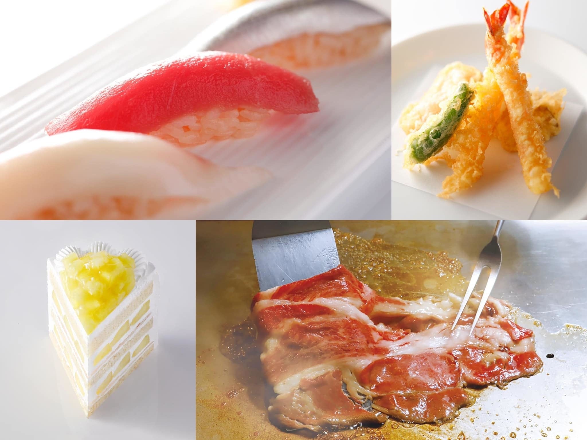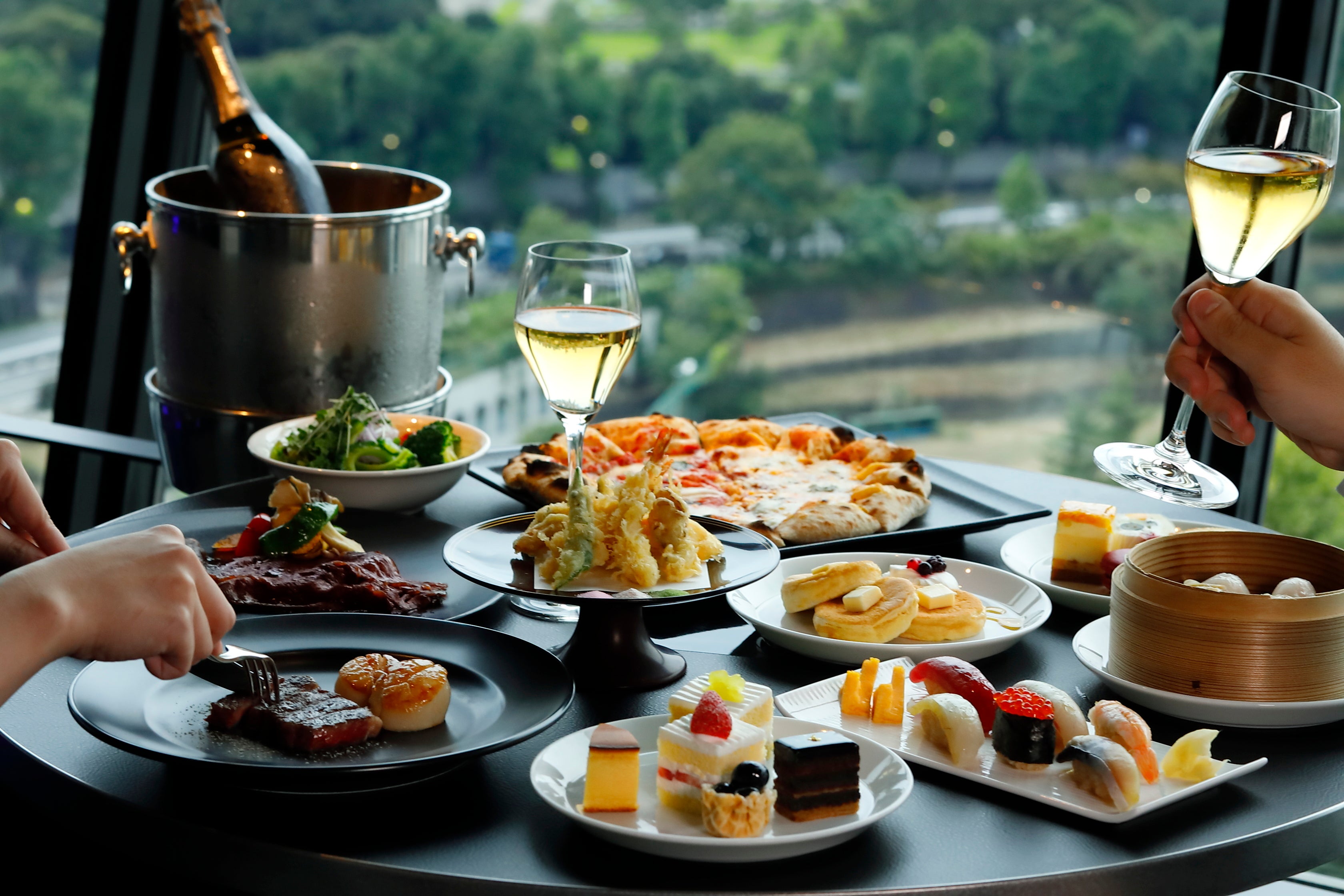 また、和・洋・中&スイーツまで50種類以上のバラエティに富んだお料理を、360°の圧倒的なパノラマ眺望とともにお愉しみいただける「VIEW & DINING THE SKY」のランチが、通常1人10,890円(土日祝11,990円)のところ、今回のプラン限定で館内利用券(10,000円分)でご利用可能に!熟練の職人による握りたてのお寿司や、厳選国産牛を目の前で焼き上げる鉄板焼、揚げたての天麩羅、パティスリーSATSUKIの人気スイーツなど、ステージキッチンより常にできたてのお料理をお愉しみいただけます。