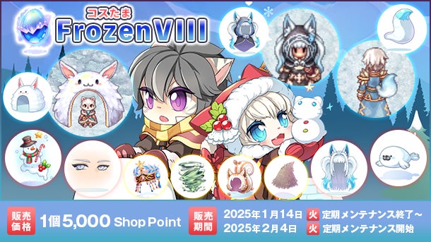 「コスたまFrozenVIII」 販売期間:2025年1月14日(火)定期メンテナンス終了~2025年2月4日(火)定期メンテナンス開始 価格:5,000Shop Point/1個 ※倉庫以外の一切の取引不可。 ※開封し、入手した衣装装備に移動制限等はありません。 |