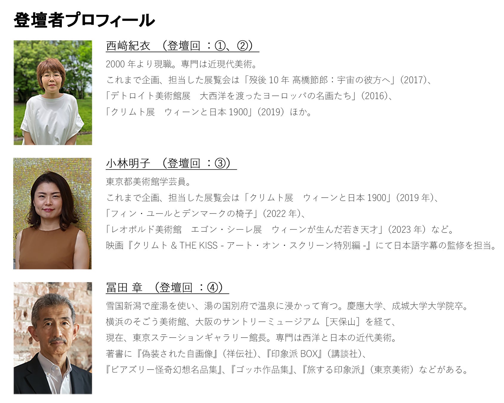 『クリムト & THE KISS -アート・オン・スクリーン特別編-』の公開を記念して、トークイベントを開催いたします。クリムトの「オイゲニア・プリマフェージの肖像」を所有する美術館・豊田市美術館の学芸員である西﨑紀衣さん、本作日本語字幕監修をご担当いただいた小林明子さん(東京都美術館 学芸員)、クリムトに関する数々の書籍を執筆されている冨田章さん(東京ステーションギャラリー 館長)にご登壇いただきます。映画にまつわるクリムト作品はもちろん、クリムト作品の魅力などをお話しいただく貴重な機会に是非足をお運びください。