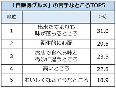 「自販機グルメ」の良いと思うところについて聞くと、1位「いつでも買えるところ」(52.0%)、2位「お店まで行かずにお店の味を楽しめるところ」(43.5%)、3位「人とやりとりせずに買えるところ」(27.6%)と、手軽さが上位にあがりました。一方苦手なところ1位は「出来たてよりも味が落ちるところ」(31.0%)と味の面での心配がトップに。そのほか、2位は「衛生的に心配」(29.5%)、3位は「お店で食べる味と微妙に違うところ」(23.3%)でした。
