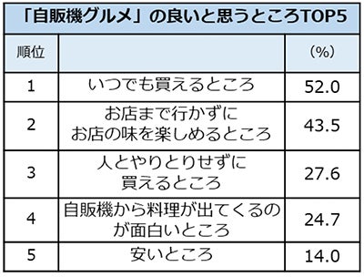 ■「自販機グルメ」の良いと思うところは「いつでも買える」、苦手なところは「味が落ちる」