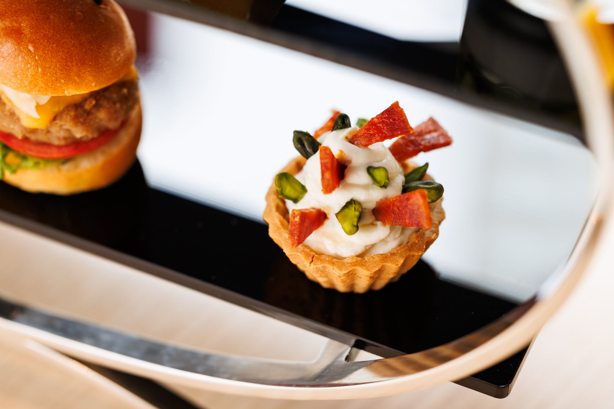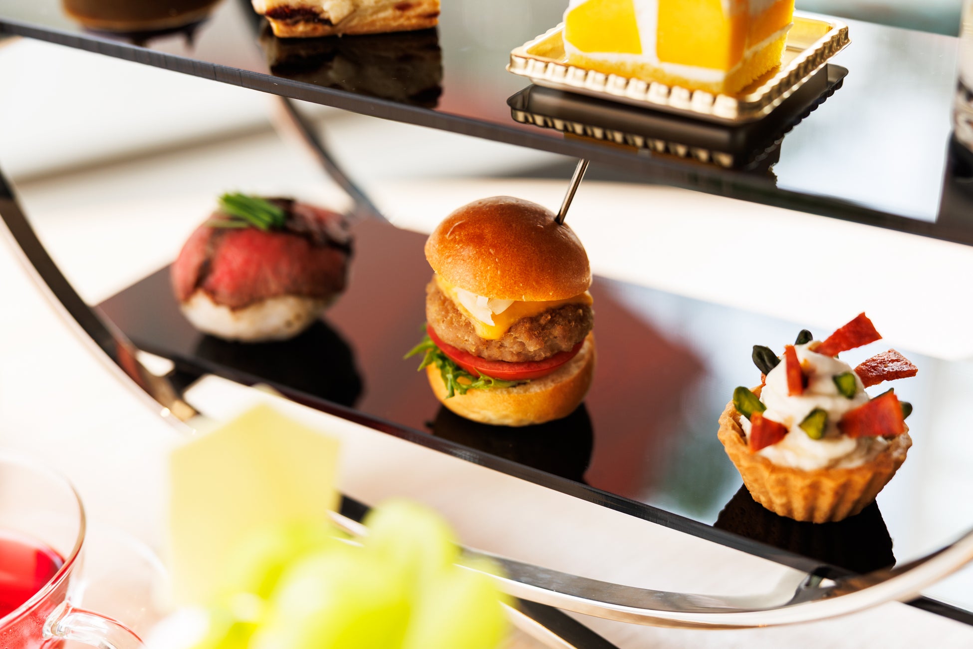 ・デザート5種、スコーン、手毬寿司、ミニチーズハンバーガー、クリームチーズのミニタルト
