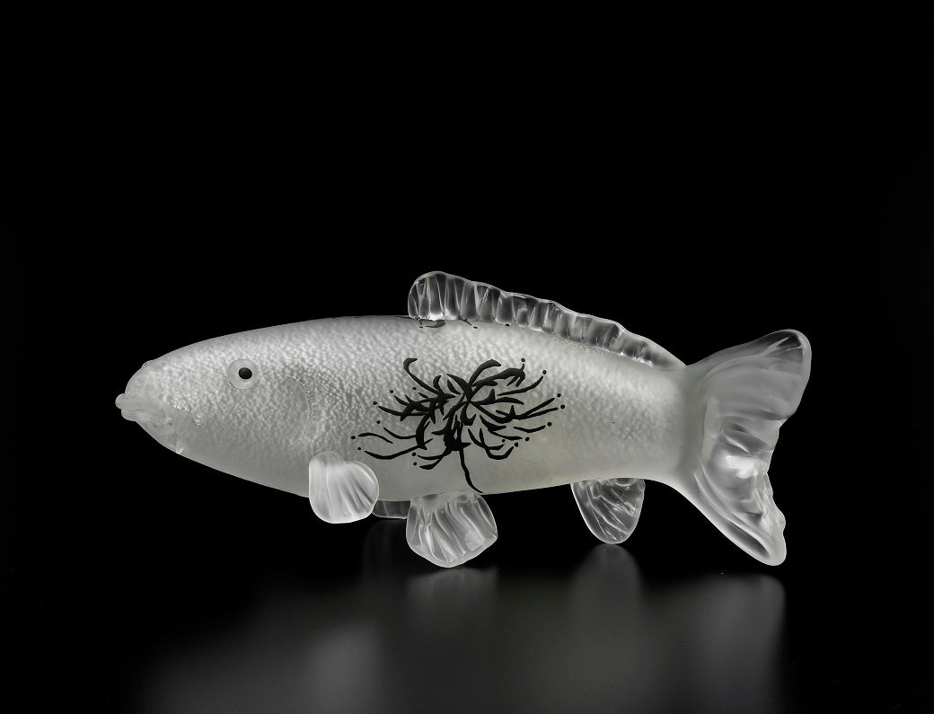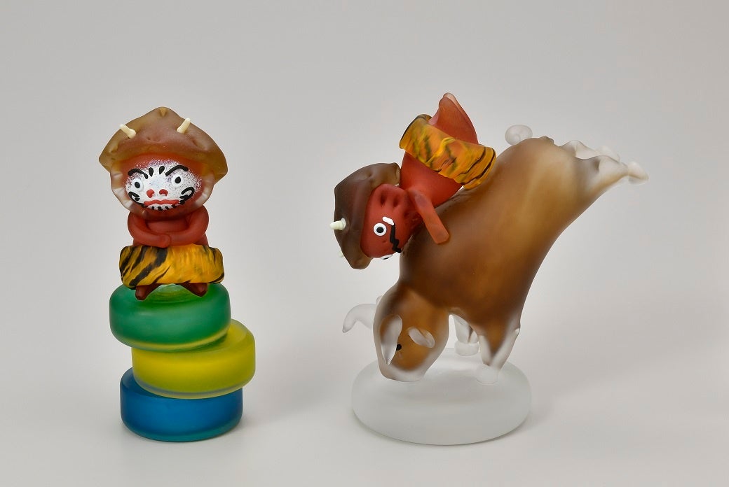 近年は、浮世絵・古典絵画からもインスピレーションを受け、歌川国芳の「金魚づくし」や、河鍋暁斎の戯画に描かれた蛙などをガラスで表現した作品は絵画の世界観をそのままに、下田顕生の個性を織り交ぜて楽しい雰囲気に溢れています。