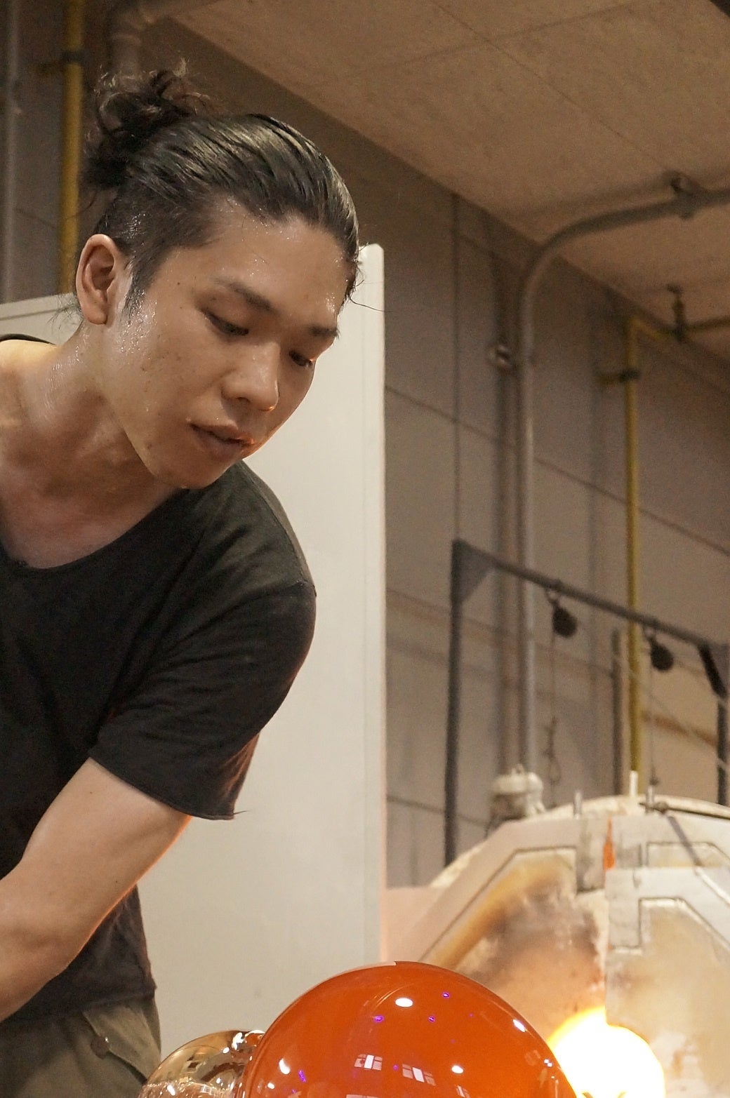 下田顕生氏は、色ガラスを組み合わせ、ホットワークを主な技法とし制作しています。