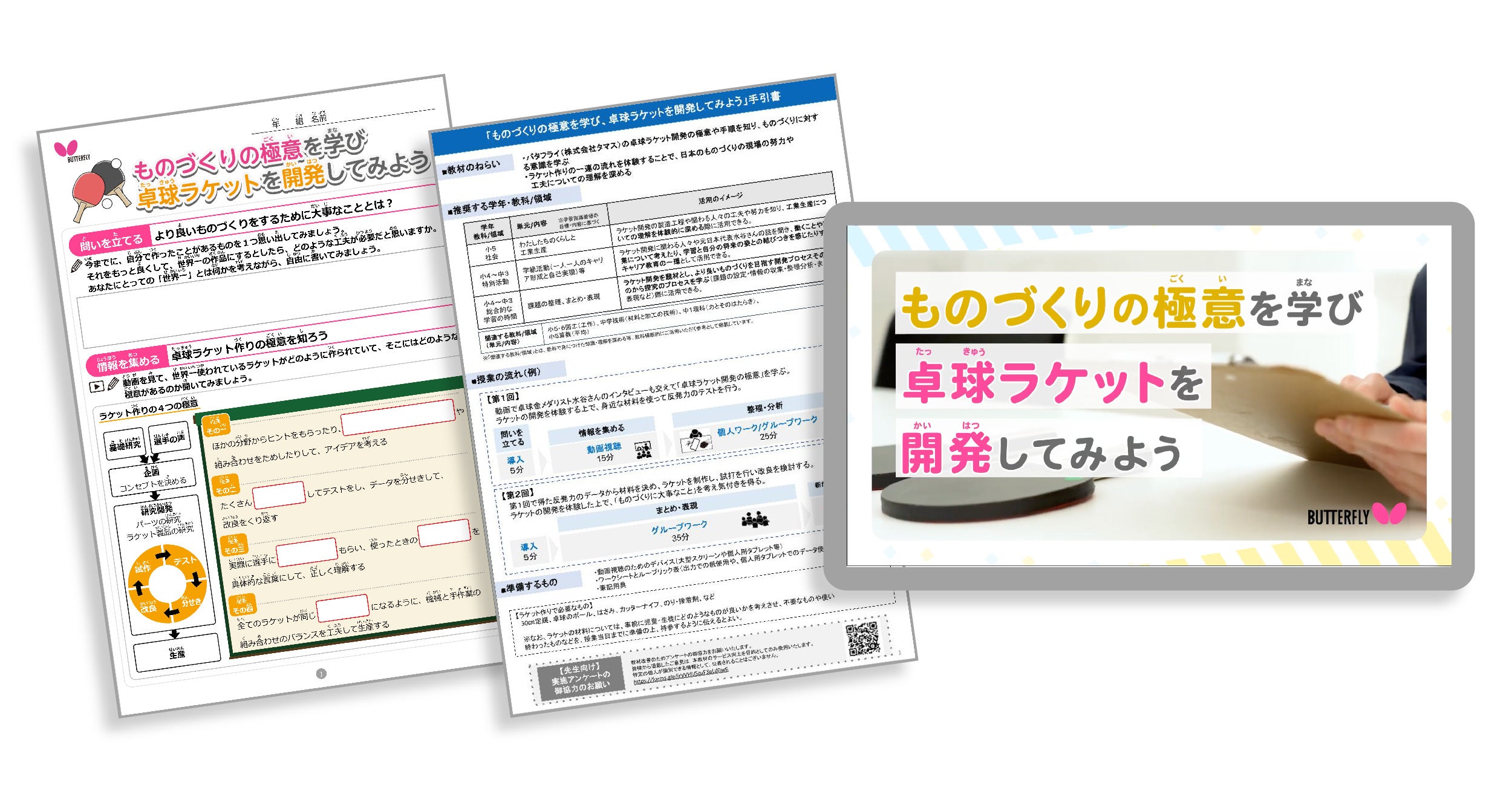映像教材では、「バタフライ」の卓球ラケットを題材に、開発者がどのように使い手のニーズに応えているのか、ものづくりの極意について詳しく掘り下げます。児童生徒たちは、そこで得た情報を参考にして、チームで「よくはね返し、打ちやすい卓球ラケット」を企画していきます。