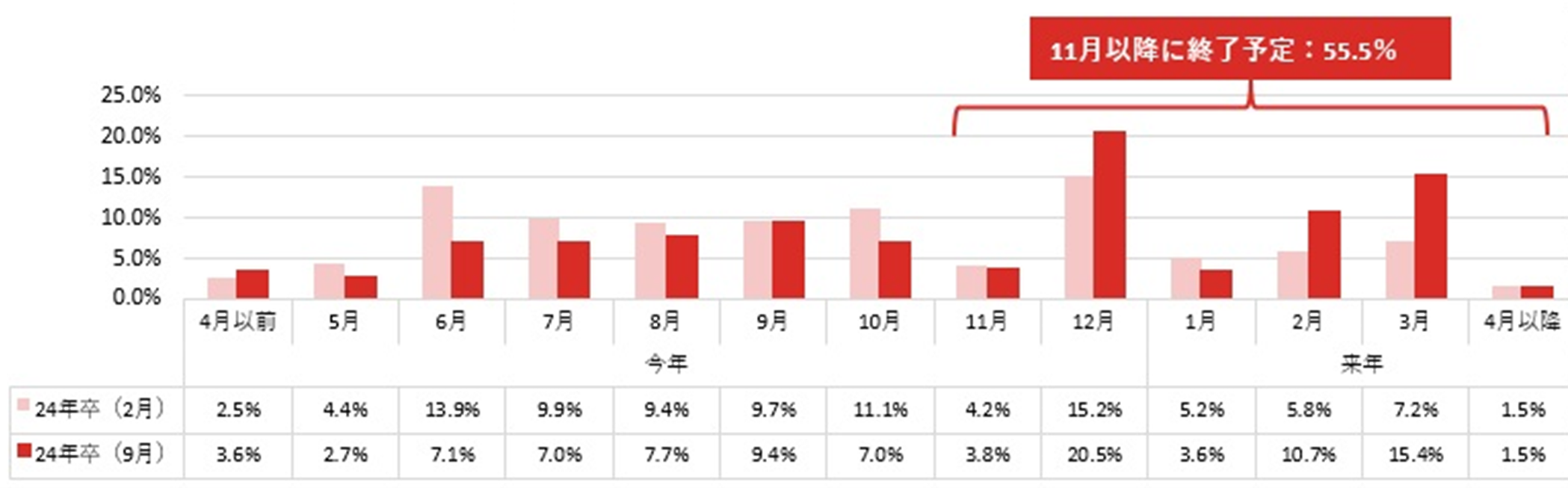24年卒の採用充足率(内定者数/募集人数)は前年比5.5pt減の75.8%で2年連続の減少となり、採用スケジュールが変更された16年卒以降、同時期の調査としては初めて8割を下回り過去最低の結果となった。内定者満足度については「質・量ともに満足」の割合が22.4%とこちらも過去最低となり、採用難度の高さが見てとれる。また、採用活動を終了する時期をみると、12月や3月に採用活動を終了する予定の企業が2月時点の調査と比較して特に増加しており、11月以降に採用活動を終了する予定の企業の合計は55.5%となった。採用の苦戦により当初の予定より採用活動が長引いている様子がわかる。【図1、2】