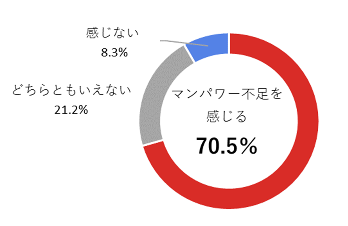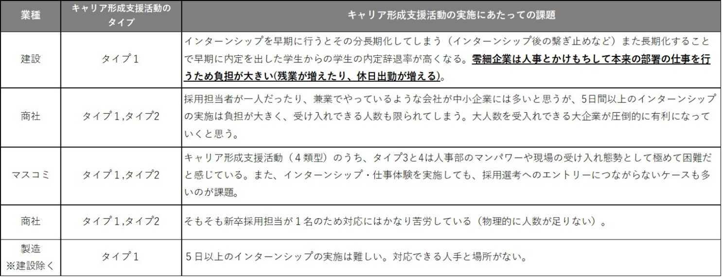 25年卒のキャリア形成支援活動は「オープン・カンパニー」の実施率がもっとも高く63.4%だった。情報利用可能な「タイプ3・4」のインターンシップを実施するには複数日程の開催や就業体験が必要になるが、採用担当者のコメントでは、「マンパワーが足りない」「他の業務と掛け持ちしている中での実施は負担が大きい」などの声が見られた。実際に、新卒採用担当部門のマンパワー不足を実感している企業は70.5%にのぼっている。採用の難化により採用手法の多様化や内定者フォローなどの対応が増えており、採用業務に対して人手が不足しているため、「タイプ3・4」のように期間が長く現場の協力も必要なキャリア形成支援活動の実施にはハードルが高いと感じる企業が多いと推察される。【図6、7、8】