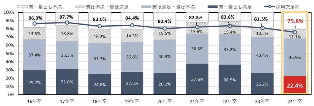 24年卒の採用充足率は75.8%で、16年卒以降最低。インターンシップ・仕事体験の実施有無で13.3ptの差。