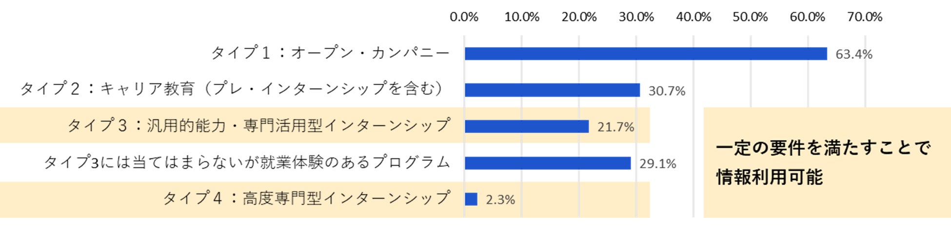 25年卒から新しい定義でのインターンシップ(タイプ3・4)を実施する企業では、約9割が参加学生の情報を採用活動に利用する予定だとわかりました。一方で、キャリア形成支援活動の中で実施率が高いのはオープン・カンパニーとなっており、インターンシップを実施するには、採用担当部署のマンパワー不足が壁となっているという声が見られます。ただ、学生との接点を持つ機会を増やすことは、採用活動が難しくなっている現在の新卒採用において重要な取り組みとなっています。「タイプ3・4」のインターンシップを実施するのが難しい企業については、まずは短期間の仕事体験のプログラムを実施するなど、できる取り組みから第一歩を踏み出してみてほしいと思います。