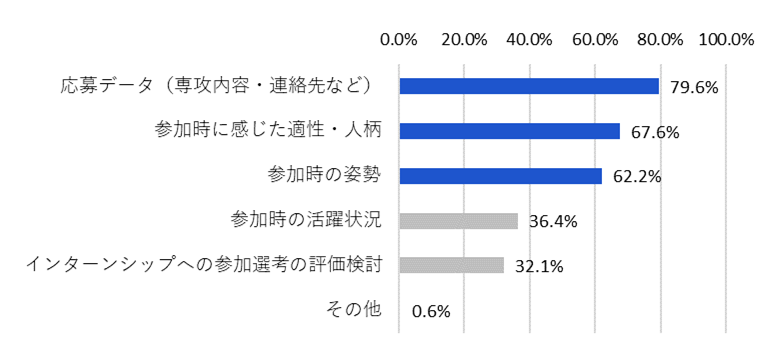 25年卒から、一定の要件を満たしたインターンシップは、参加学生の情報を採用活動に利用することが可能となったが、要件を満たす「タイプ3・4」のインターンシップを実施予定の企業のうち、88.5%が情報利用の予定があると回答した。最も利用予定が多いのは「応募データ(専攻内容・連絡先など)」の79.6%で、参加者情報を採用広報解禁後の選考案内等に使うことを想定していると考えられる。また、「参加時に感じた適性・人柄(67.6%)」や「参加時の姿勢(62.2%)」も利用予定の割合が6割以上と、インターンシップで得た情報を採用活動に繋げていきたい企業は多いようだ。【図4、5】