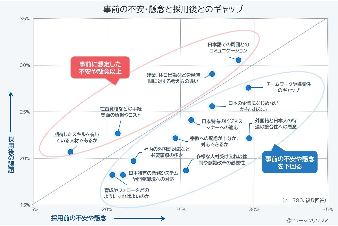一方、採用前に不安や懸念を持っていた項目と、採用後に実際に課題として顕在化した項目を比較すると、「日本語での社内コミュニケーション」が最も大きな課題として表面化していることがわかりました。事前に懸念として認識しているものの、採用後の課題感は事前予測を上回る結果であり、想定以上に日本での就労において、日本語の壁が高いことがわかります。そのほか、事前の懸念を上回った「労働時間に対する考え方の違い」や、事前の懸念を下回っているものの採用後に課題として表面化している「チームワークや協業性のギャップ」など、異文化に起因する働き方に関する価値観の違いによる摩擦も浮き彫りとなっています。