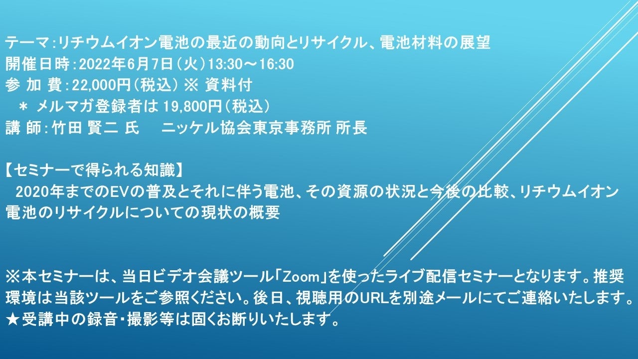 先端技術情報や市場情報を提供している(株)シーエムシー・リサーチ(千代田区神田錦町: https://cmcre.com/ )では、 各種材料・化学品などの市場動向・技術動向のセミナーや書籍発行を行っておりますが、 このたび「リチウムイオン電池の最近の動向とリサイクル、電池材料の展望」と題するセミナーを、 講師に竹田 賢二 氏 ニッケル協会東京事務所 所長)をお迎えし、2022年6月7日(火)13:30より、 ZOOMを利用したライブ配信で開催いたします。 受講料は、 一般:22,000円(税込)、 弊社メルマガ会員:19,800円(税込)となっております(資料付)。