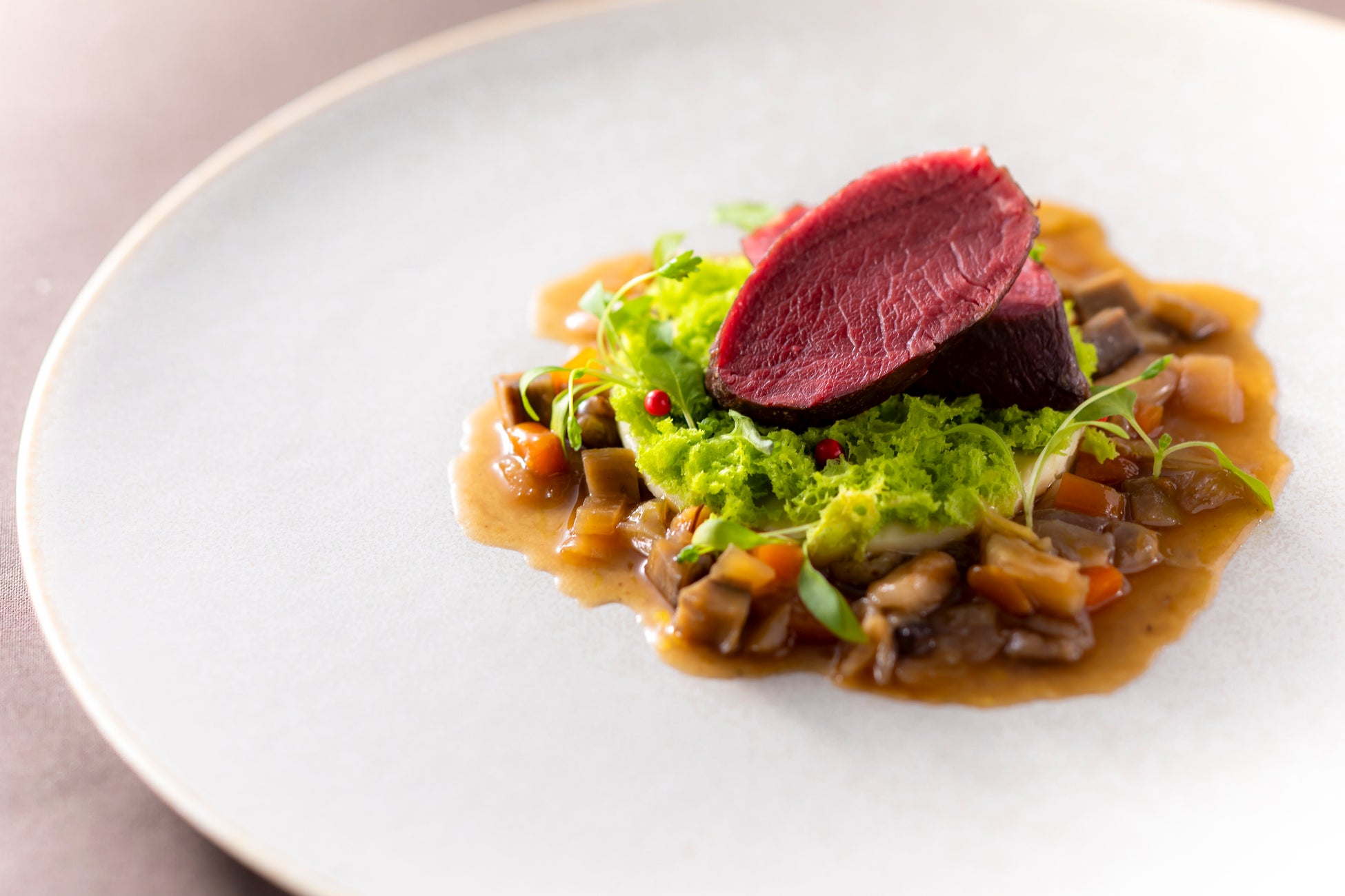 ・丹波鹿とあつらえ本しめじのパストラル風 新田農園 堀川ごぼうのソースで