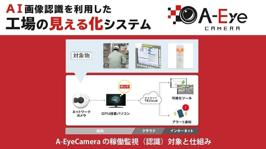 ネットワークカメラで撮影した画像を元にAI(人工知能)が生産設備の稼働状況を判断し、クラウドに情報を蓄積するIoTシステム。 蓄積した情報をリアルタイムに集計・分析し、稼働状況を共有することで「工場の見える化」を推進します。