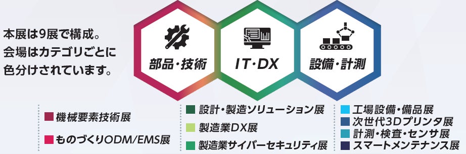 IT、DX製品、部品、設備、装置、計測製品などを扱う企業が国内外から出展し、製造業の設計、開発、製造、生産技術、購買、情報システム部門の方々と活発に商談が行われる展示会です。製造業の最先端事例が学べるセミナーも見どころの一つです。本展は製品カテゴリーごとに9つの展示会で構成されています。