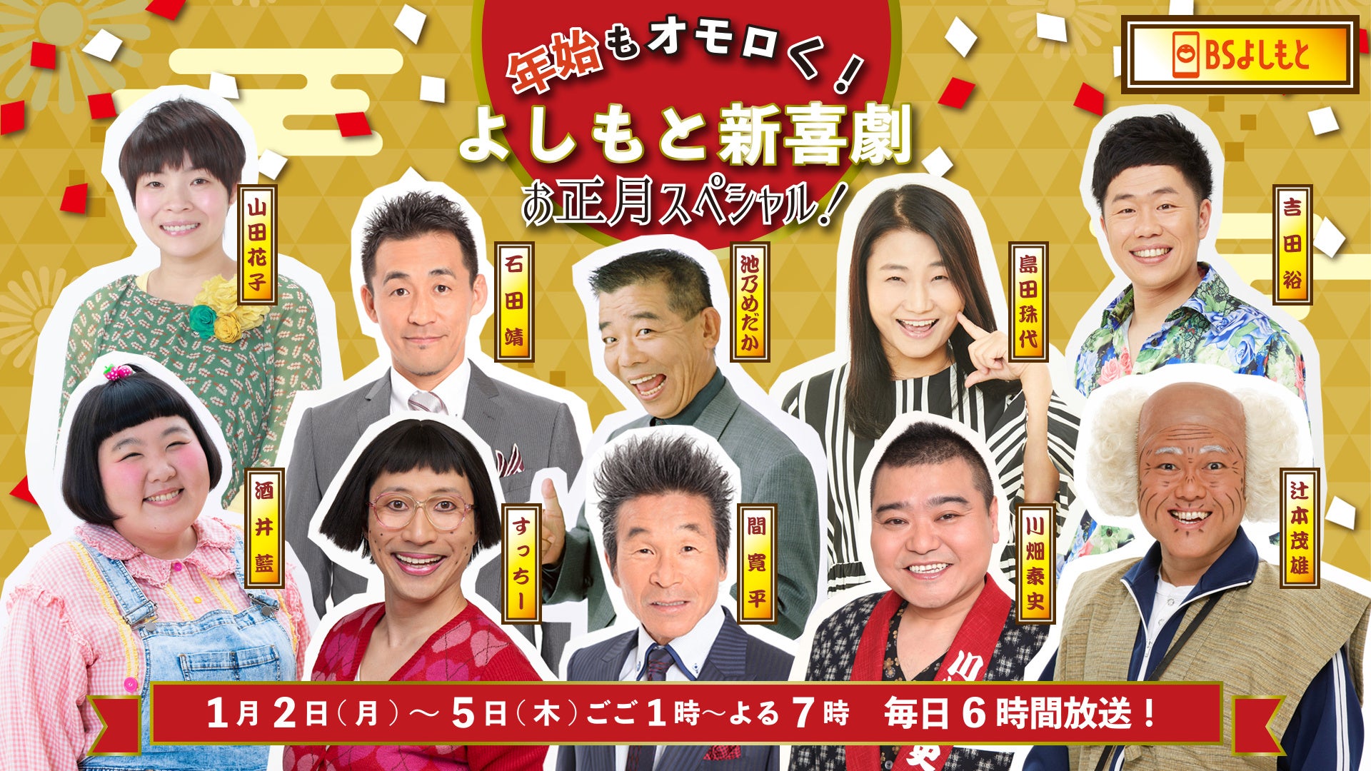 この度、BSよしもとでは、「年始もオモロく!よしもと新喜劇 お正月スペシャル!」として、新年1月2日(月)から5日(木)までの4日間連続で、毎日ごご1時~よる7時の6時間、よしもと新喜劇の過去特番からお薦めの作品をお送りいたします。新年はBSよしもとで、笑いっぱなしのお正月をお過ごしください!