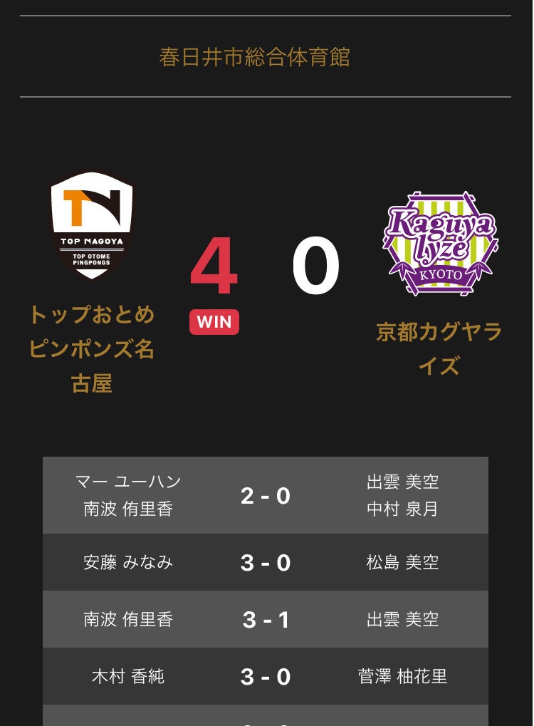 トップおとめピンポンズ名古屋 vs 京都カグヤライズ は、4-0でトップおとめピンポンズ名古屋が勝利しました。
