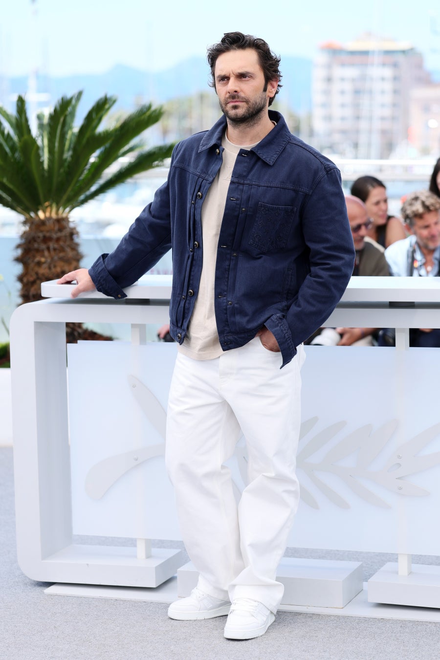 またピオ·マルマイは、映画「Le Roi Soleil(原題)」のフォトコールに、ネイビーの「ガーメントダイ デニムタイプⅡトラッカージャケット」にベージュのTシャツ、ホワイトジーンズ、ホワイトのスニーカーを合わせました。