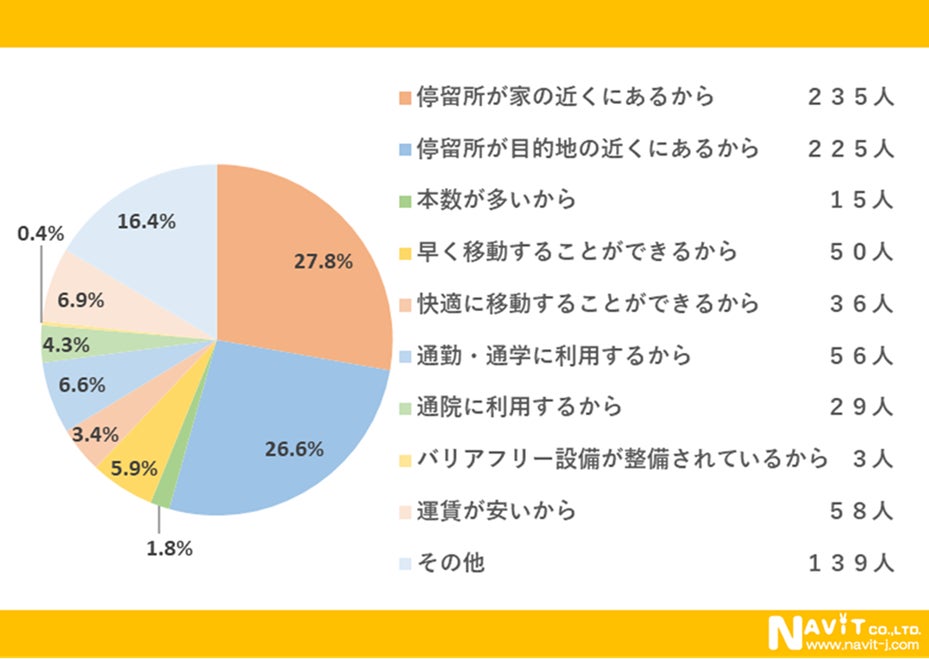 バスを利用したい理由についてのアンケートでは、「停留所が自宅または目的地の近くにあるため」という回答が、合わせて50%を超える結果になりました。