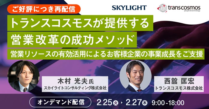 トランスコスモスは、オンラインセミナー【ご好評につき再配信】トランスコスモスが提供する営業改革の成功メソッド~営業リソースの有効活用によるお客様企業の事業成長をご支援~を2月25日(火)、2月26日(水)、2月27日(木)に開催します。