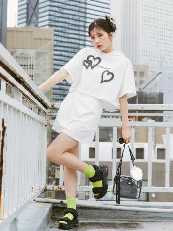 単品でも、上下セットでも着回しが楽しめるフーディーセットアップです。フーディとスカートの後ろポッケにハートのスプレープリントが施されていて、スカートの裾にあるフープチャームがさりげないおしゃれ感を演出します。(※フープチャームは取り外し可能)
