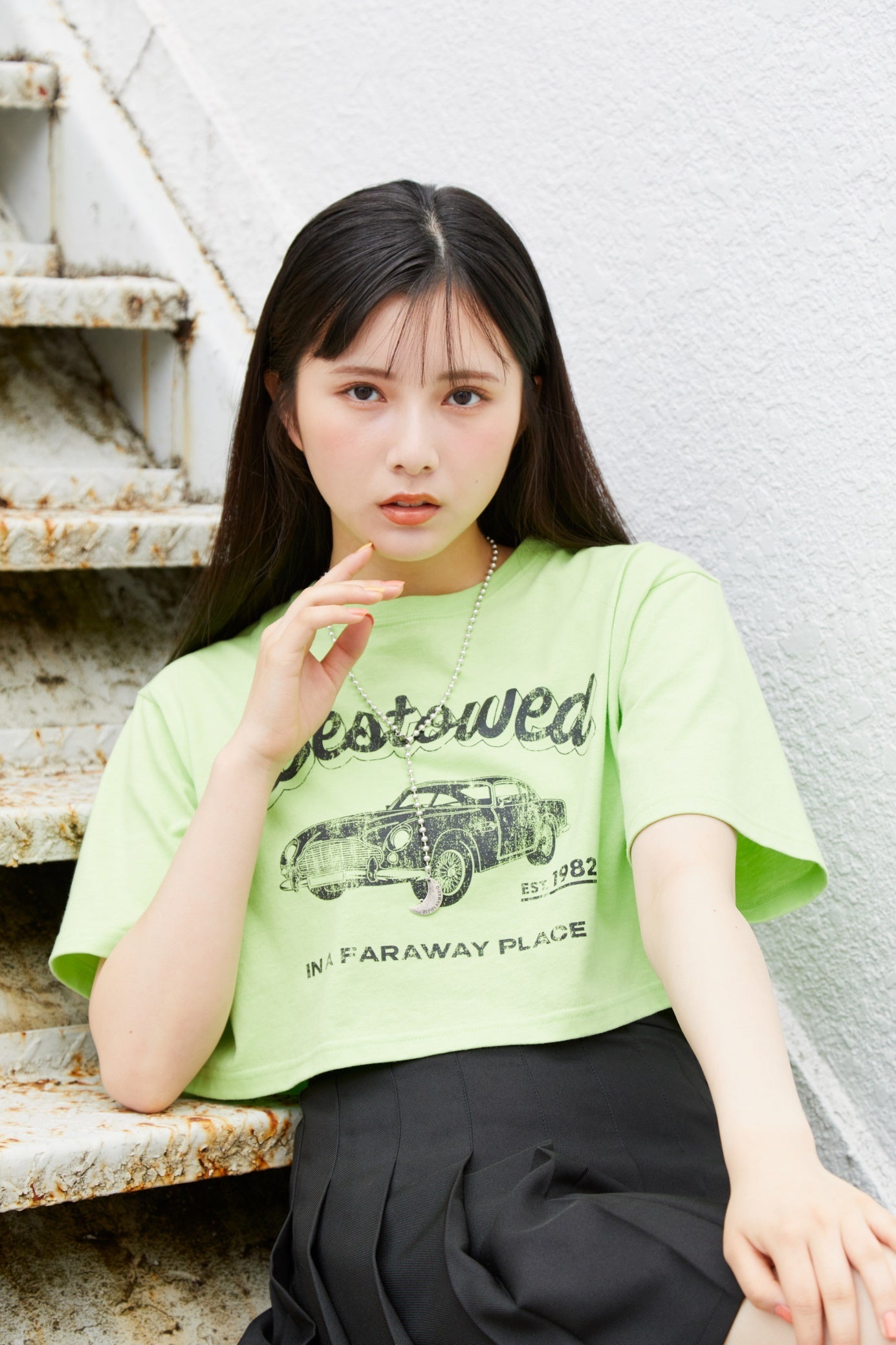 ヴィンテージ風のかすれプリントで車をかっこよく表現したショート丈Tシャツです。ハイウェストのスカートをあわせたお腹チラ見せコーディネートなどが楽しめます。