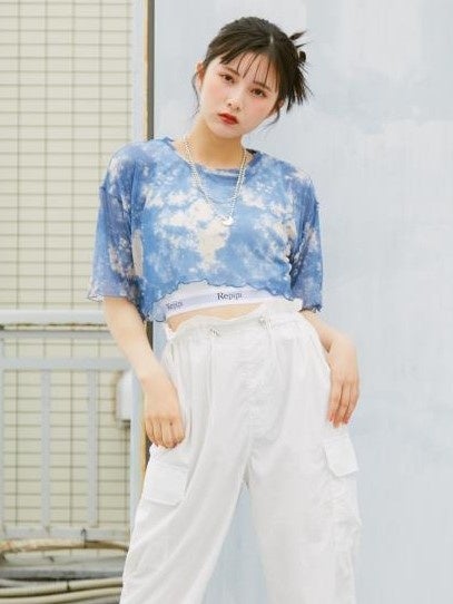 涼しげなシアー素材のタイダイTとロゴタンクのセットアイテム。トレンドのロゴインナーとセットで着ると、お腹チラ見せの即オシャレコーデが完成します。