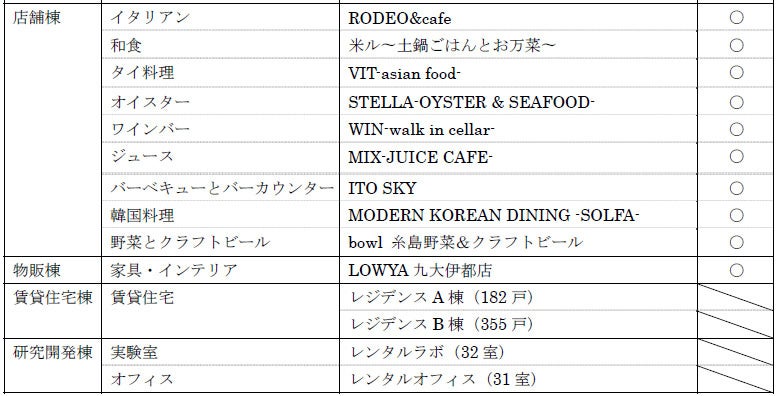 敷地面積は3.1haで、研究開発棟にはレンタルラボ・レンタルオフィス約60室とコワークスペース、会議室、ラウンジなどを設置します。商業棟には書籍をはじめ、イベントスペースや飲食店も備えたライフスタイル提案型書店「九大伊都 蔦屋書店」が入居します。また、株式会社学生情報センターが管理運営する賃貸住宅棟は、約18㎡、約20㎡、約28㎡の家具・家電付きワンルームマンション(537戸)で、食堂や交流ラウンジも設置しました。