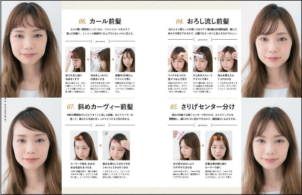 本書では前髪をカットすることなく、ドライヤーやカーラー、アイロンを使うだけでできる前髪アレンジを11パターン紹介。