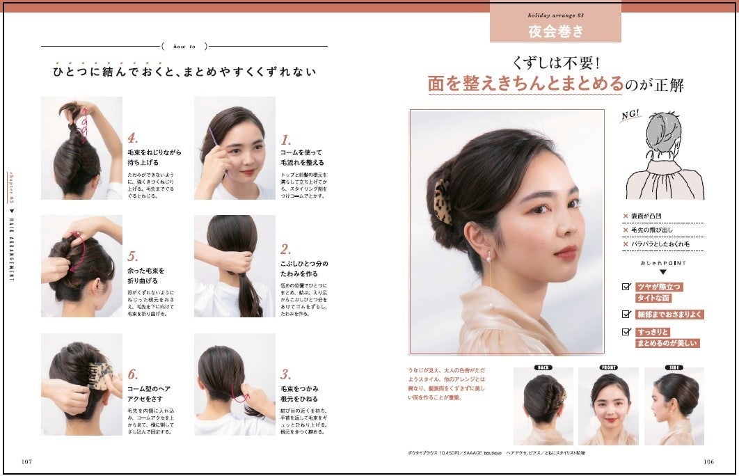 アレンジごとのポイントだけでなく、「毛束の引き出し方」「ヘアゴムの隠し方」「おくれ毛の巻き方」も紹介し、ワンランク上のアレンジを実現します。