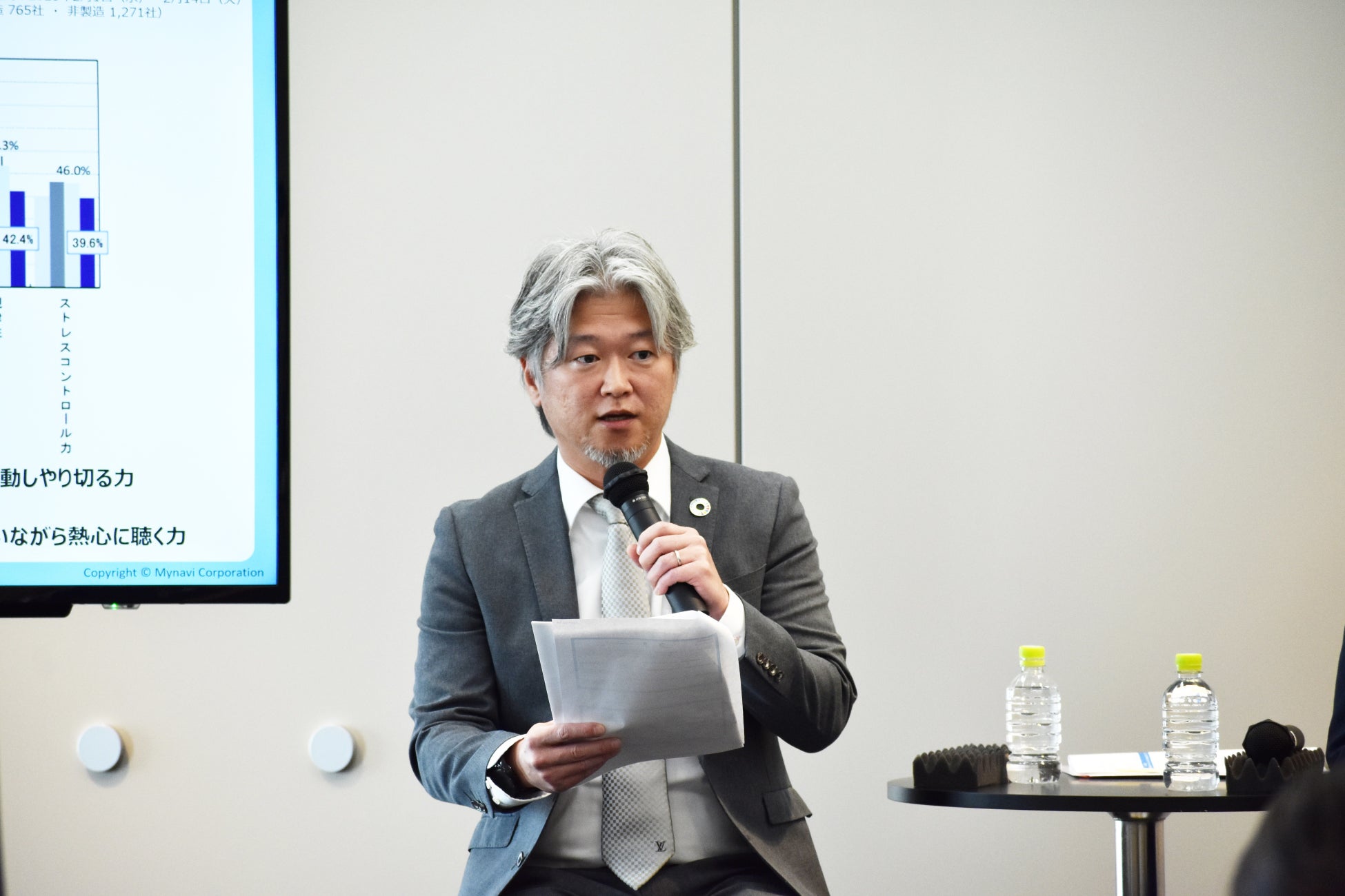 木村は、採用において学生が評価されるポイントに触れた上で、「他者と協力して同じ目標の達成に向けて行動できる能力はこの先の未来でも求められている」と話しました。今求められていることと、2050年に求められている能力には大きな変化があると予測されることから、幼少期からどのような能力を育んでいく必要があるかを考える事が大事だと説明。「指導環境においては将来活躍する人材の個人の能力を伸ばすことを意識し、適切なマネジメントが重要である」と述べました。