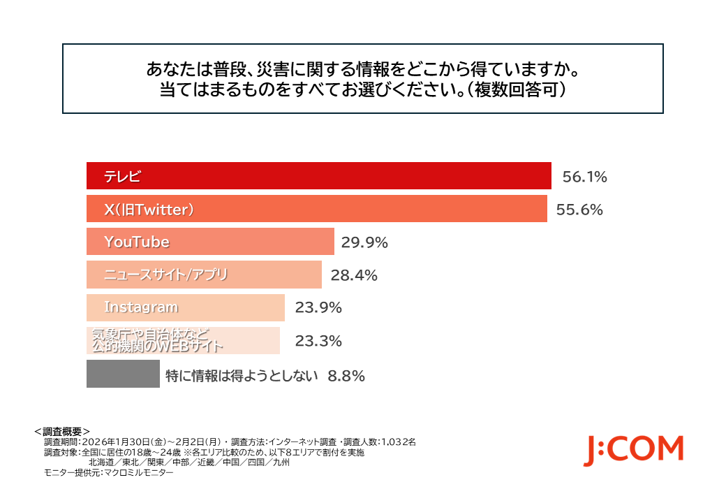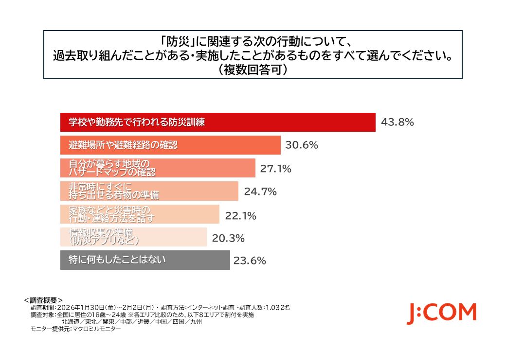 JCOM株式会社(J:COM、本社:東京都千代田区、代表取締役社長:岩木 陽一)は、日本赤十字社(日赤、所在地:東京都港区、社長:清家 篤)と連携し、若年層(全国に居住の18歳~24歳1,032名)を対象に、「若年層の防災に関する意識調査」を実施しました。