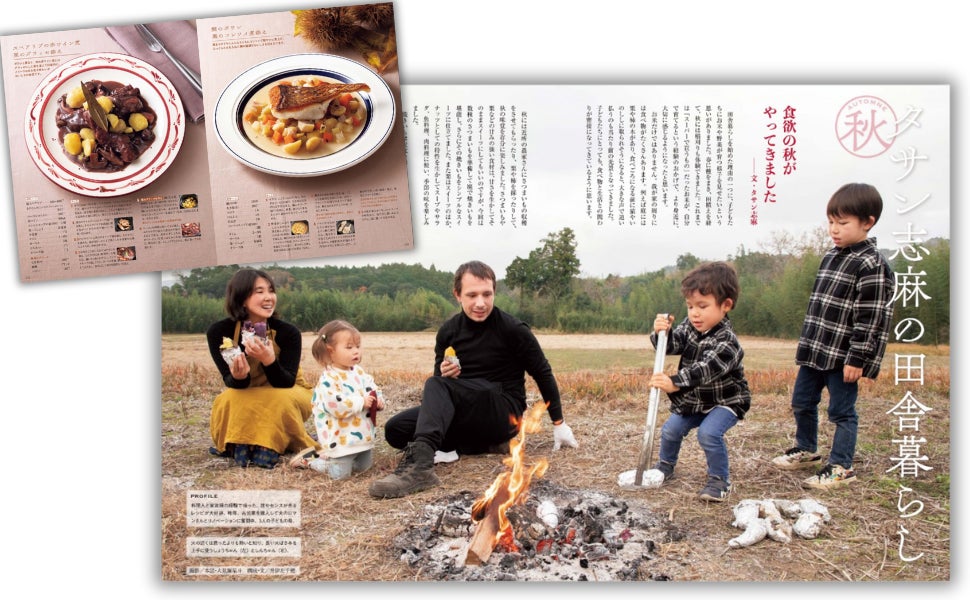 古民家のある静かな里山を舞台にした大好評のタサン志麻さんの季節連載、今号は秋の味覚をたっぷりお届けします。近所の農家で収穫したさつまいもは、炭火をおこして焼きいもにし、さらにスイーツに。庭で採れた栗はスイーツのほかにも、スープやサラダ、魚料理、肉料理でいただきます。収穫から家族で体験することで”特別なできごと”になる。そんな志麻さん一家の心豊かな暮らしをお届けします。