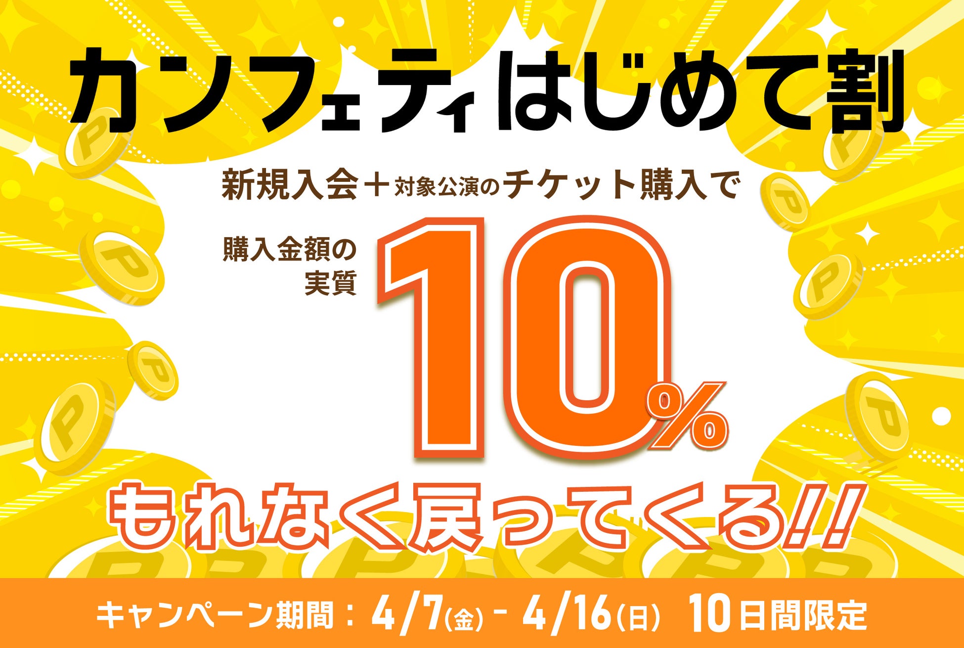 4月7日(金)から10日間限定で実施する「はじめて割キャンペーン」では、同じくカンフェティに新規無料会員登録&対象公演のチケット購入(※)した方全員に、購入金額の10%をカンフェティポイントでもれなく付与致します。