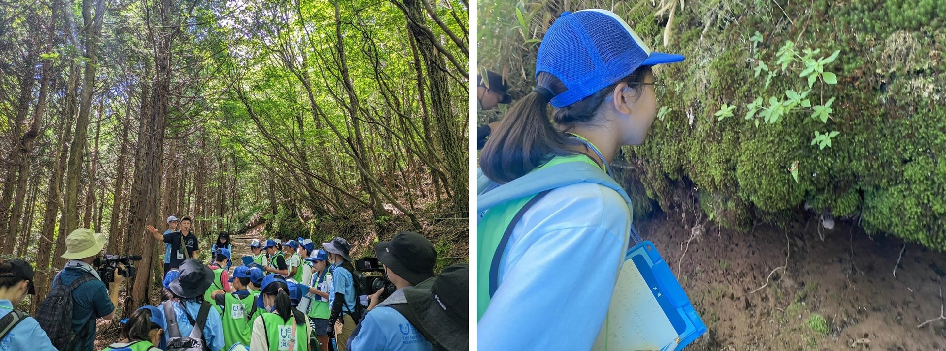 森里海を巡る大冒険は石鎚山系の森林学習からスタートしました。まずは石鎚ロープウェイに乗車し山頂成就駅へ。NPO法人西条自然学校の山本貴仁理事長を講師に迎え、標高約1,400mの涼しい山の中を歩きながら森の役割や森と海の繋がりを学びました。海に流れている水の始まりは山に降った雨で、森があることで雨を受け止めて土壌の中をゆっくりと流れることで山の養分が混じり合い栄養豊かな水が生まれることや、また愛媛県の山林には保水率の高い自然林が人工林と比べて少ない現状が森の課題であることを知りました。参加者は実際に苔についている水滴を見て、「この水滴が始まりになりやがて川になっていくのが素敵」と、山と海の繋がりを学びました。
