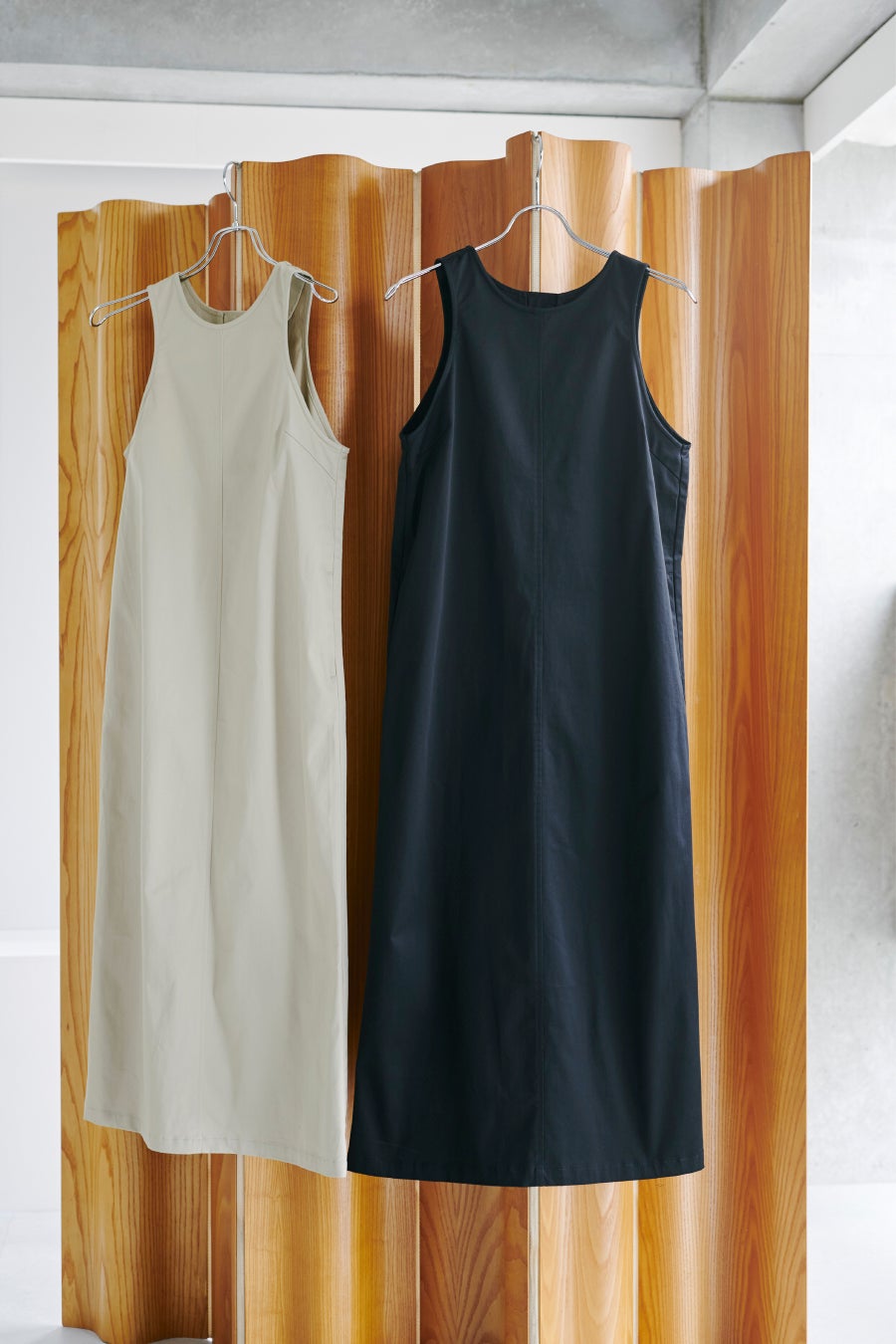 潔く肩を見せるアメリカンスリーブ、体のラインを拾わない真っすぐなライン、光沢あるチノ素材のワンピース。細部へのこだわりこそが、同時に品よくヘルシーさを纏える理由。ストレッチ素材で動きやすく程よく肉厚。着心地抜群です。