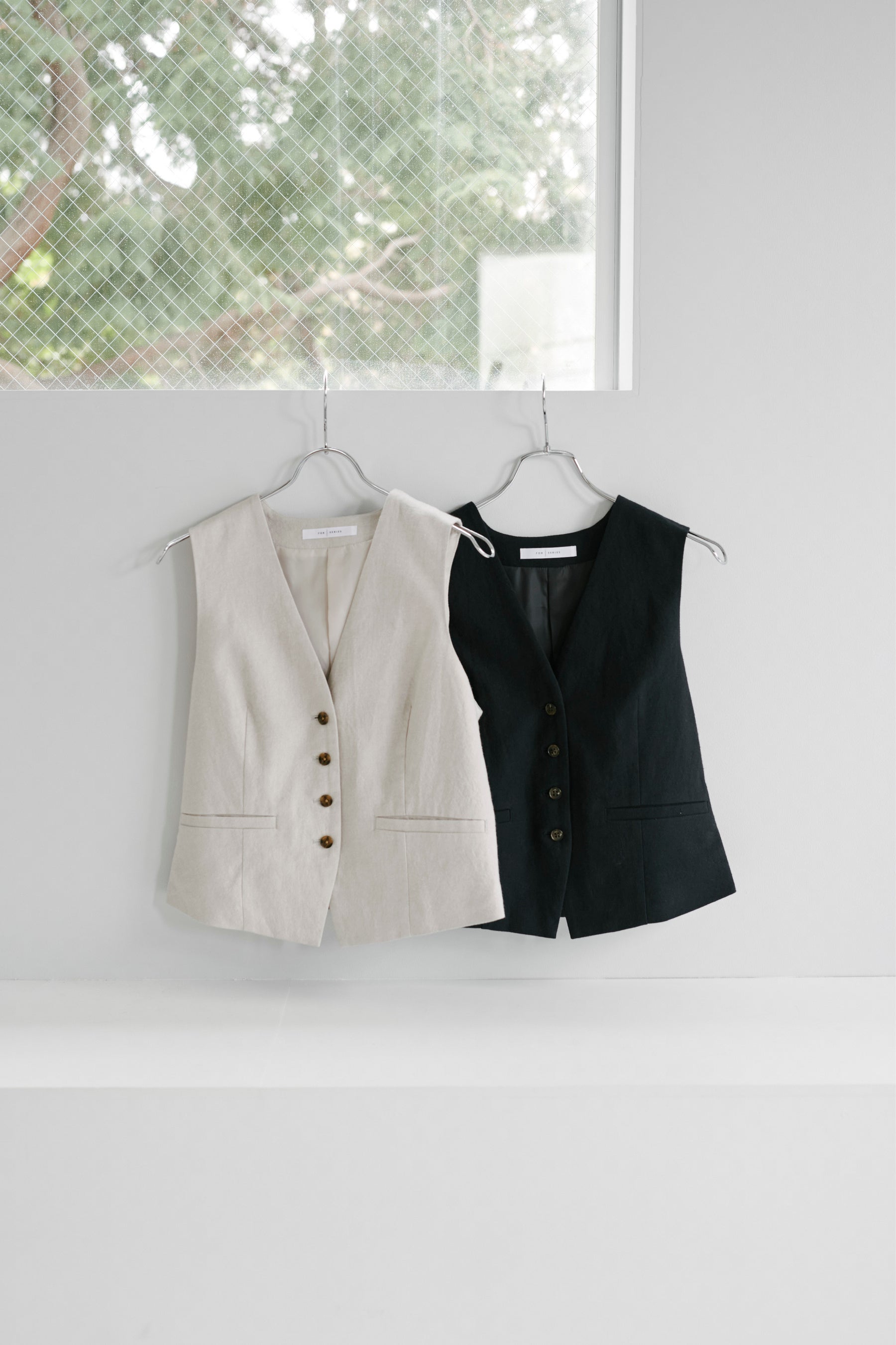 今年らしいスタイルをつくるキーアイテムのリネンベスト。Tシャツに重ねるボーイッシュな着こなしも、タンクトップを忍ばせるヘルシーな肌見せもサマになる1着です。ベージュとブラックは、ロングスカートとセットアップで着られます。