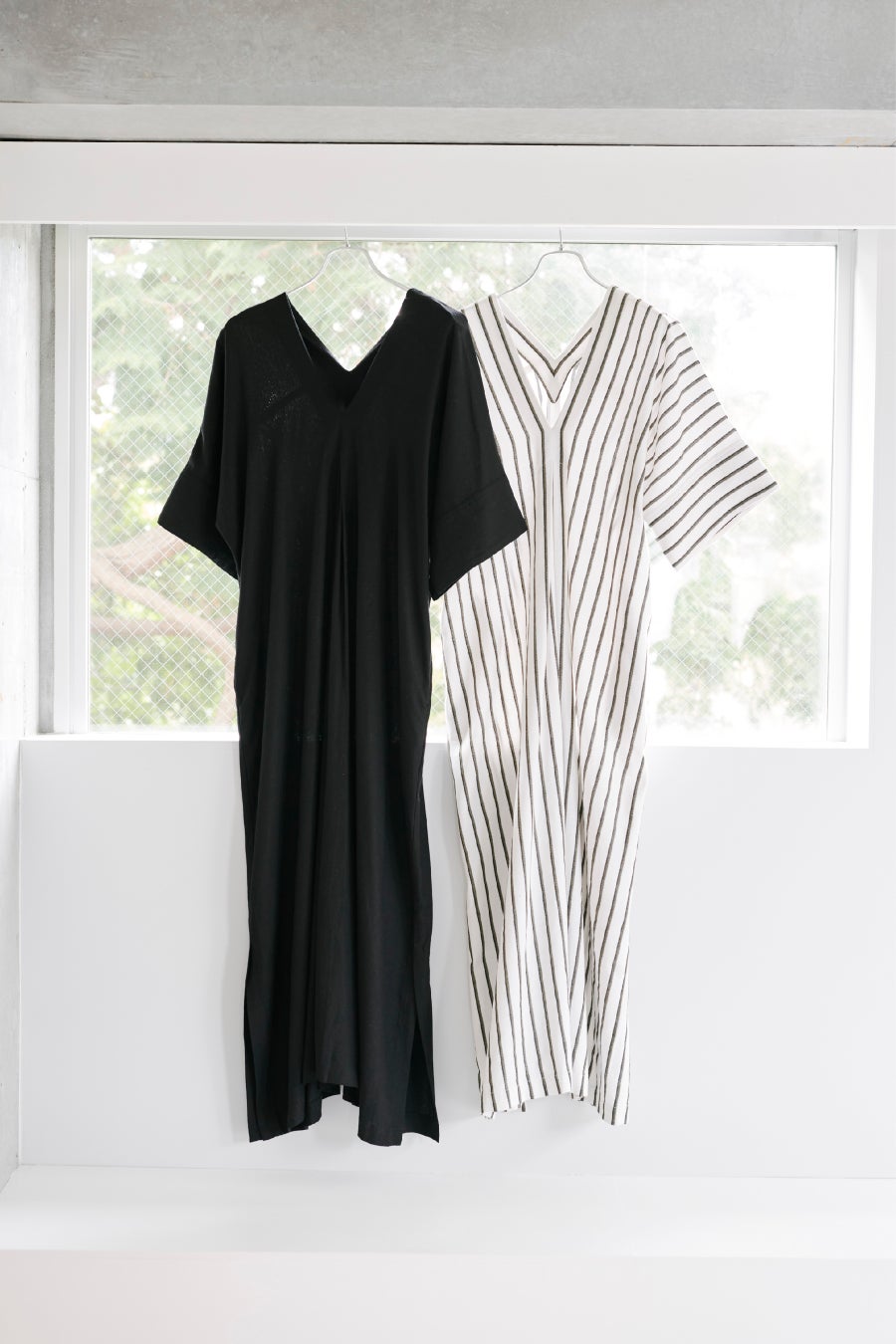 定番のロングワンピースを袖スリット入りのデザインにブラッシュアップ。レーヨンリネンのしなやかさ、着痩せ効果抜群のシルエットはそのままに、抜け感がさらにプラスされました。裾スリットのおかげで、足捌きも軽やか。