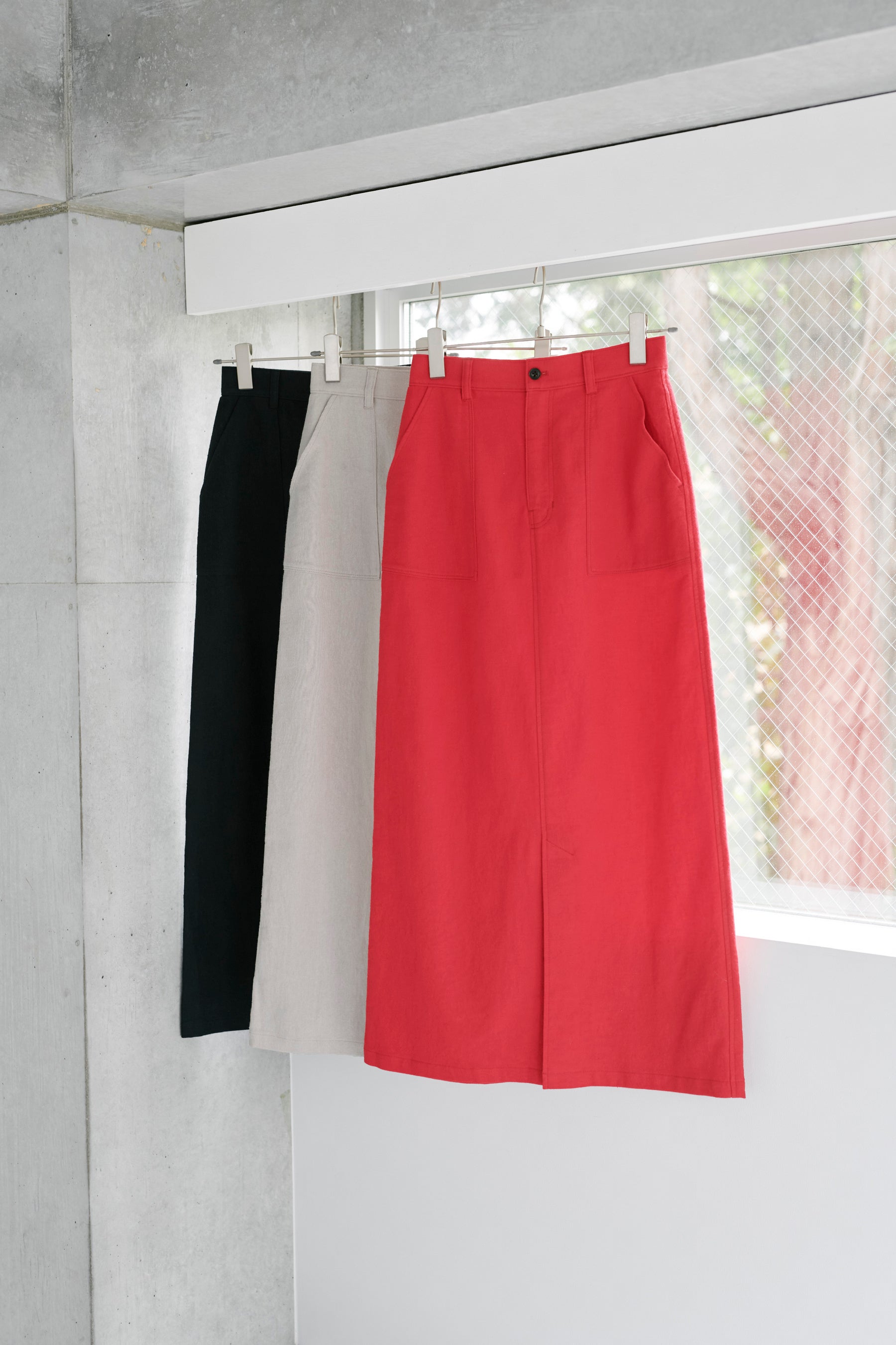 ややハイウエストで腰回りをすっきりと仕上げたリネンスカートは、程よく体に沿うシルエットが新鮮。リネンらしい光沢感が、カジュアルにもフェミニンにも振れる万能さの理由。同素材のベストと合わせれば、ワンピース風の着こなしも。