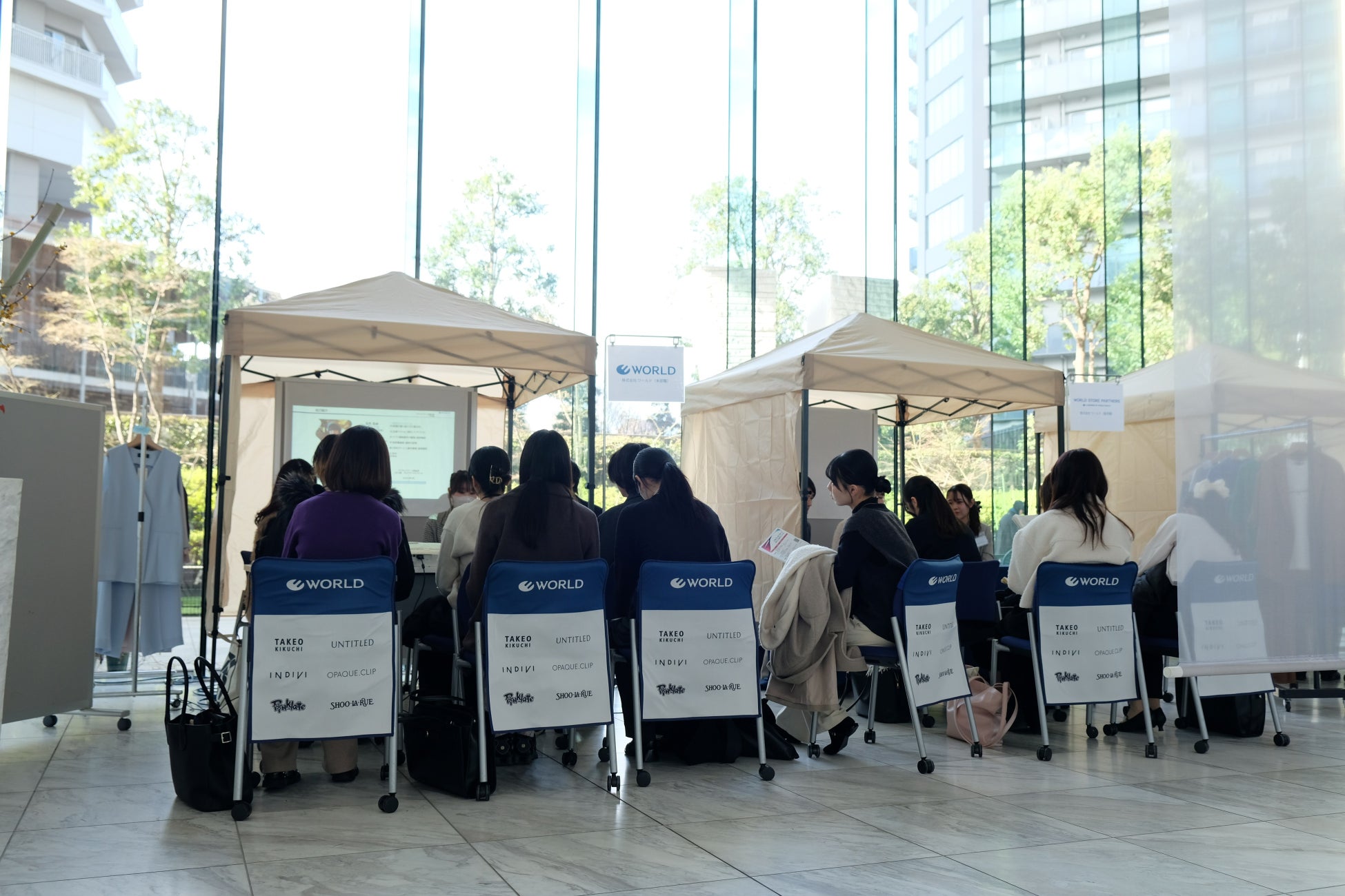 本イベントは、アパレル・ファッション業界に関心を持つ学生に当グループの多岐にわたる事業領域を体感していただき、業界への理解や興味を深めるとともに、将来のキャリア選択の幅を広げることを目的としています。今回はワールドグループ内の9社が出展し、来場した学生は幅広いビジネスフィールドとさまざまなキャリアの可能性に触れました。