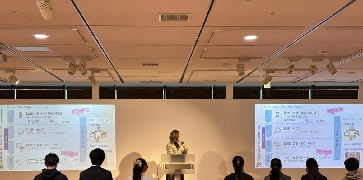 ワールドグループは「価値創造企業グループ」として、長期的かつ持続的に価値を創出するため、アパレルにとどまらずブランド創出力、デジタル・プラットフォーム、サーキュラーなど多岐の領域にわたる事業を展開し、総合ファッションサービスグループの実現を目指しています。本イベントは、多事業・多業態を実際に体験できる総合型の業界研究として実施し、グループ全体の事業構造を体系的に学べる場と、各社を横断比較することで参加者が自身の興味・適性を明確にできる機会を提供しました。