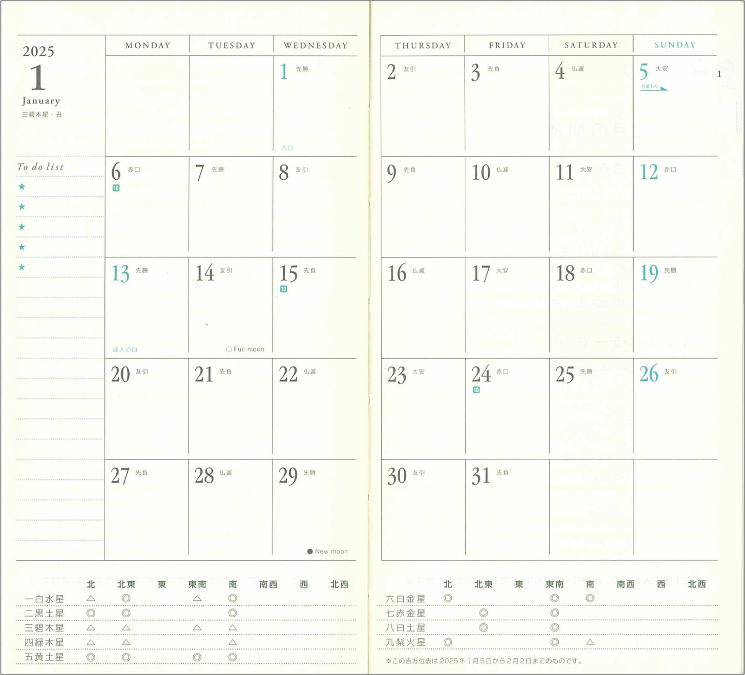 その月の吉方位がわかる「本命星別吉方位表」を掲載しています。吉方位旅行などに活用できます。もちろん月全体のスケジュール把握にも大活躍。