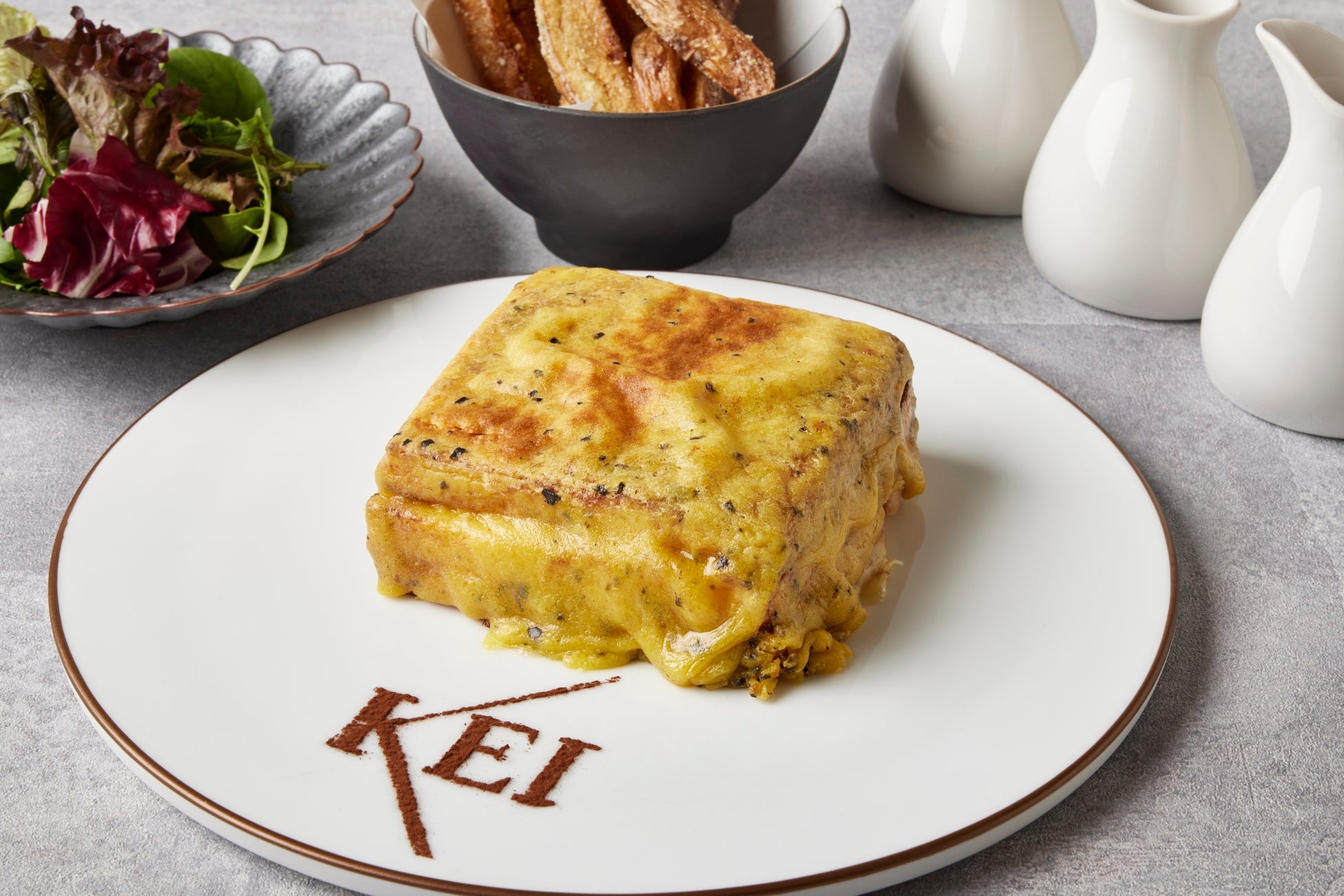 ホテル内フレンチレストラン「Héritage by Kei Kobayashi (エリタージュ バイ ケイ コバヤシ)」を監修している、パリで活躍する三つ星シェフ小林圭氏による「黒トリュフ クロックムッシュー(7,800円)」がザ・ロビーラウンジにてお楽しみいただけます。フランス発祥のホットサンドイッチであるクロックムッシューに黒トリュフ、コンテ、グリュイエール、パルメザンの3種のチーズ、ベシャメルソース、ロースハムを使用し、濃厚で贅沢なワンランク上の味わいに仕上げています。