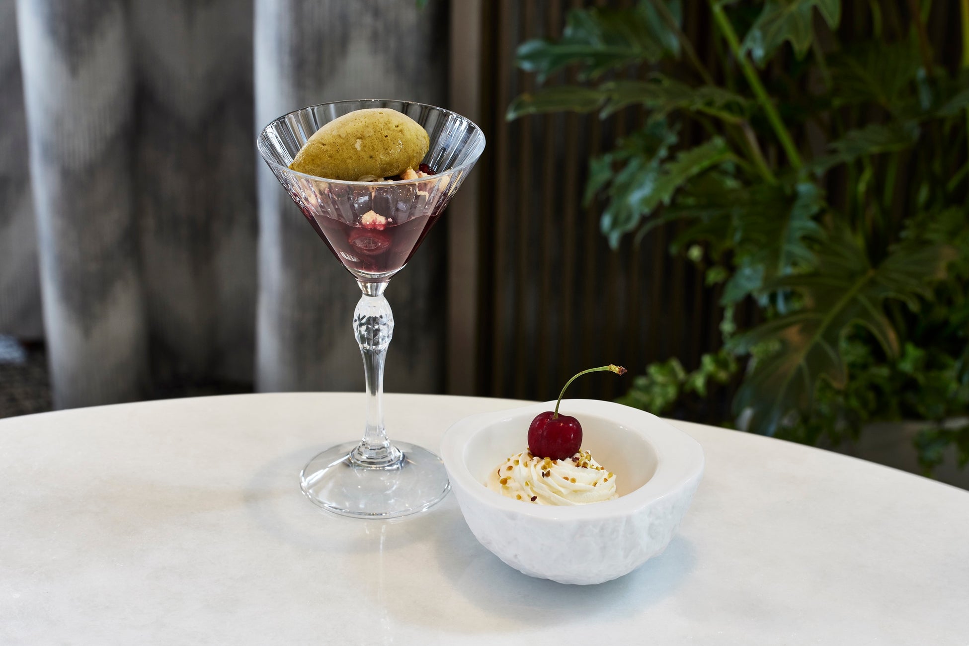 昼下がりのティータイムから、一日を締めくくるパフェやデザートに至るまで、様々なニーズにお応えする各種デザートをご用意いたします。繊細なメレンゲ使いを得意とするペストリーシェフ小堀真弓による、季節ごとに旬の果物を使用したパフェ(現在は「メロンパフェ」(4,400円))や、真っ白なメレンゲ、生クリーム、季節のフルーツで仕上げる「シーズナル パブロワ」(3,200円)、「チェリーフランベ」(3,200円)、「プロフィットロール」(2,800円)、「フォンダンショコラバローナ」(2,800円)の全5品を提供いたします。