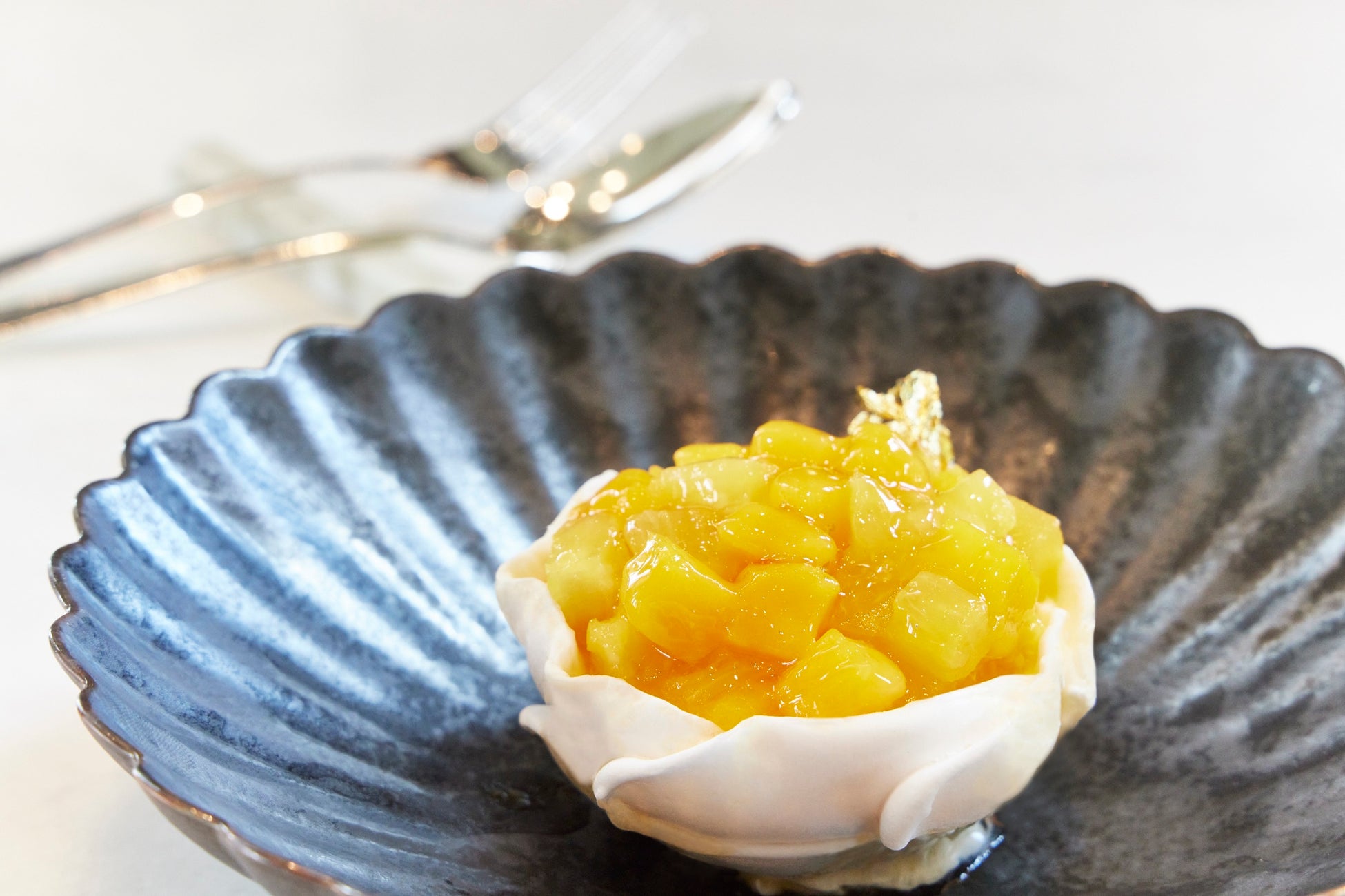 副総料理長の中野琢治が、2カ月ごとに食材テーマを設定し、料理とデザートを提供いたします。今年夏のテーマ食材は「白桃」です。大型で、糖度12%を超えるジューシーな日本の桃を使用し、「白桃と車エビ」(4,900円)、「白桃のガスパチョ」(1,860円)、「ジェラニウム風味のピーチタルト」(3,600円)、「白桃ババ」(3,300円)といった白桃の甘みとフレッシュさを活かした品々をご用意します。