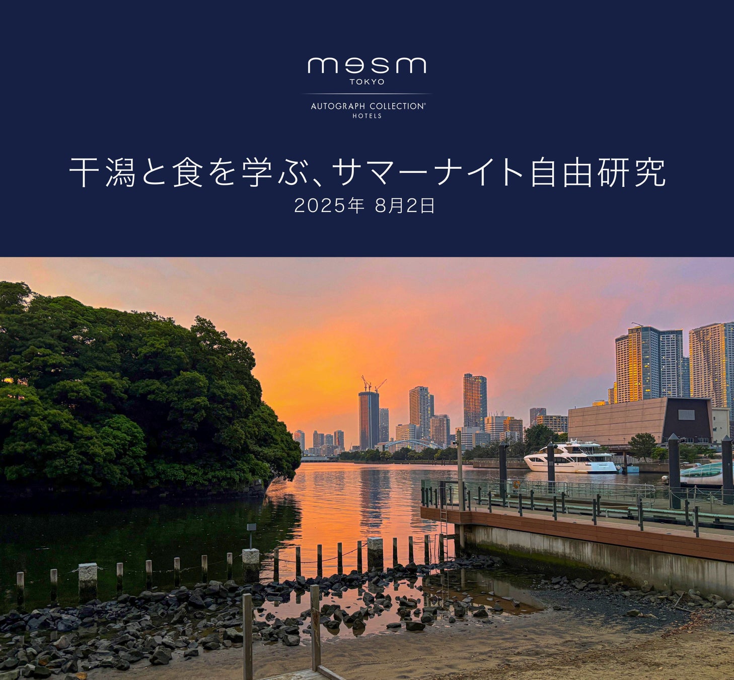 東京の躍動感や波長と共鳴し、上質な空間でクリエイティブな体験ができるモダンラグジュアリーホテル『メズム東京、オートグラフ コレクション(以下、メズム東京)』(港区海岸1-10-30/総支配人 生沼久)は、2025年8月2日(土)に、夏休みの特別ワークショップ「五感でふれる“東京の海の今”。干潟と食を学ぶ、サマーナイト自由研究」を開催いたします。