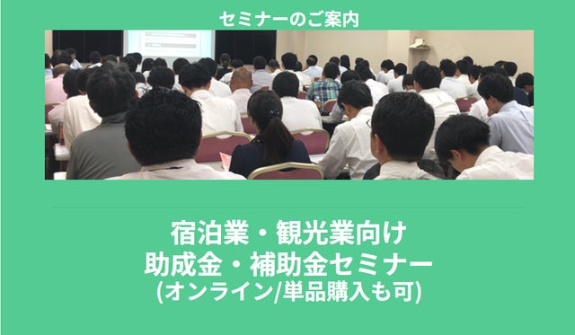 「宿泊業・観光業向け助成金・補助金セミナー(オンライン/単品購入も可)」の配信を開始しました。助成金なうでは補助金の申請サポートを承っております。